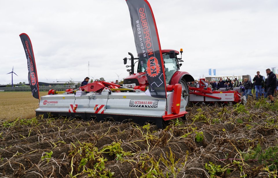 Een van de blikvangers was de achtrijige Octamax-loofklapper in combinatie met de looftrekker Agriwing van Kloppenburg. De 6 meter brede machines zijn hydraulisch opklapbaar en hebben een bodemvolgende diepteregeling. De Octamax 800-loofklapper in de fronthef weegt 2.080 kilo en de Agriwing 800-looftrekker heeft een gewicht van 2.480 kilo.