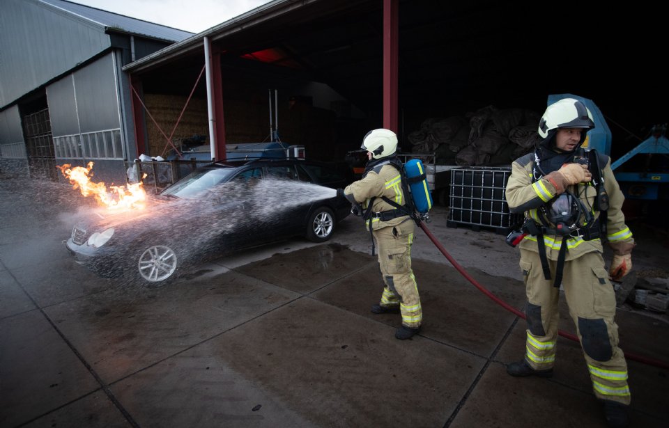 Conform het uitgedachte scenario vloog die wagen op het erf in brand, vlak bij een dieseltank en in de buurt van een paar strobalen. Het vuur sloeg vervolgens naar binnen, een aardappelschuur in. Om het realiteitsgehalte nog verder te vergroten, werd een rookmachine ingezet. Bults: 'Rookontwikkeling ontneemt je niet alleen het zicht, de rookgassen kunnen ook nog eens extreem gevaarlijk zijn. Iets om rekening mee te houden dus.'