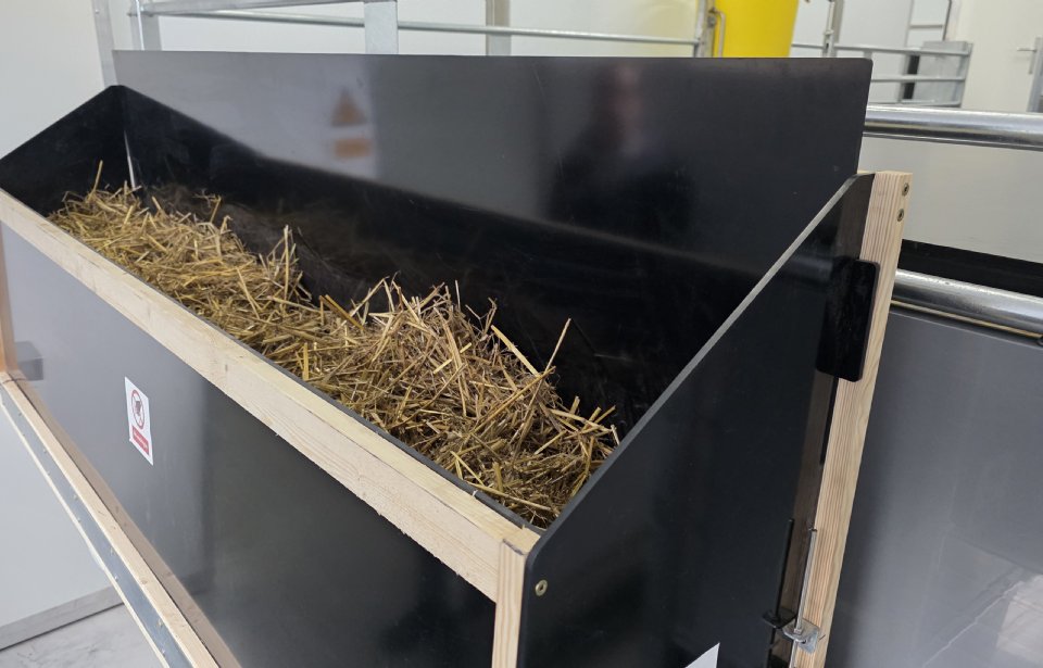 Instrooien met stro of ander materiaal kan met een robot. Stadsboerderij Hushoven beschikt over een voorraadbak met stro van waaruit het stro op de band komt. De medewerkers van de zorgtak vullen de voorraadbak tijdens het verzorgen van de varkens steeds bij.