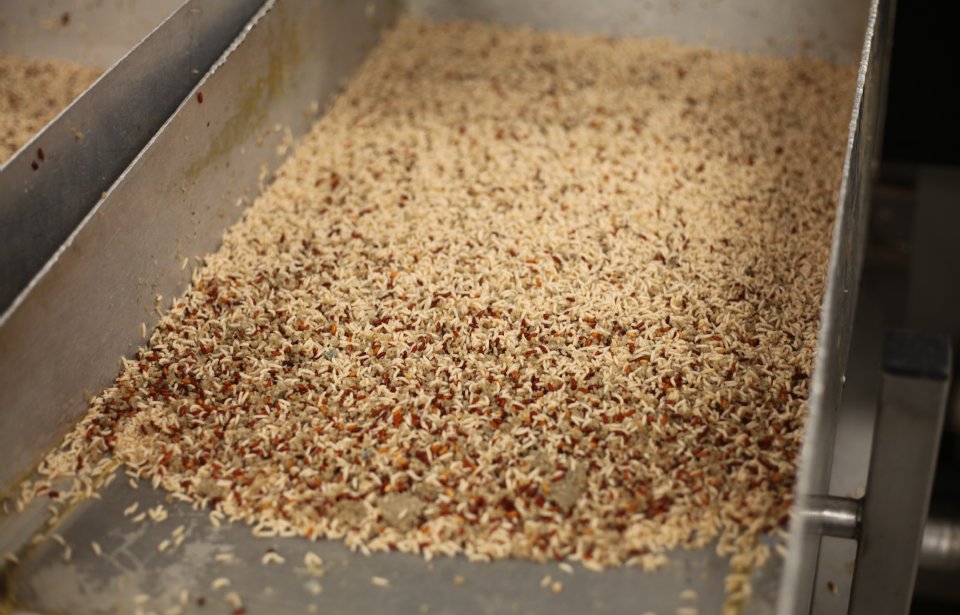 Na het afwegen worden de eitjes per lift naar beneden getransporteerd, waar het productieproces verder gaat. In speciale bakken wordt een voedingsbodem bereid. De voeding bestaat uit diverse ingrediënten. In de voedingsbodem komen de eitjes uit en ontwikkelen zich de larven. 'Na ongeveer tweeënhalve week zijn ze volgroeid en klaar om te verpoppen', zo licht Van der Woude toe tijdens de rondleiding.