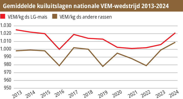 Groot Koerkamp: 'Je kunt het ook doorrekenen aan de hand van de cijfers uit de Aanbevelende Rassenlijst 2026. Een ras als LG 31.206 Animal Nutrition levert 60 VEM per kilo droge stof meer dan het ras met de laagste voederwaarde. Als je dat doorrekent voor een gemiddeld Nederlands melkveebedrijf met 4 kilo aan droge stof mais in het rantsoen – dat is nog aan de lage kant –, dan hebben we het jaarlijks over bijna 10.000 kVEM meer. Dat staat gelijk aan 22.000 kilo extra melk in de tank. Kritisch zijn op de maisrassenkeuze loont dus behoorlijk.'