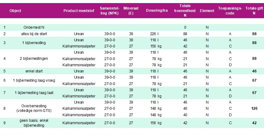 Viaverda legde in 2025 een proef aan waarbij een norm gold van 88 kilo minerale stikstof per hectare. De proef van de onderzoeksinstelling in België bestond uit verschillende trappen, van nulbemesting voor stikstof tot 88 kilo stikstof per hectare. In één object is de maximale norm van 125 kilo stikstof per hectare gehanteerd.