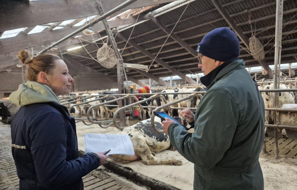 Teunis is in alles enthousiast en vertelt gepassioneerd over wat hij doet bij het inschrijven van de vaarzen. 'Ik beoordeel op functionele kenmerken die betrekking hebben op levensduur en gebruikskenmerken. Iedereen wil een gezonde koe, die gemakkelijk oud wordt. Maar als een koe drie jaar ouder wordt, moet ze ook 30.000 kilo melk meer geven'.