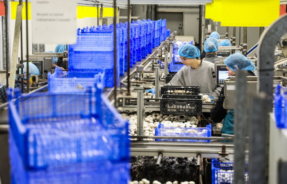In januari wordt het wat rustiger op het bedrijf. Voor Pasen en Kerstmis is het druk, met een relatief rustige periode in de zomer. 'Maar de seizoenen worden stabieler; mensen eten nu het hele jaar door champignons. Dus wij oogsten jaarrond zeven dagen per week', vertelt Koolen. Dat zijn lange dagen; de eerste werknemers komen om 06:30 uur, de laatsten werken tot 17:30 uur. Velen maken een werkweek in vier dagen. Bij Koolen werken ruim 150 mensen, vast en op uitzendbasis.