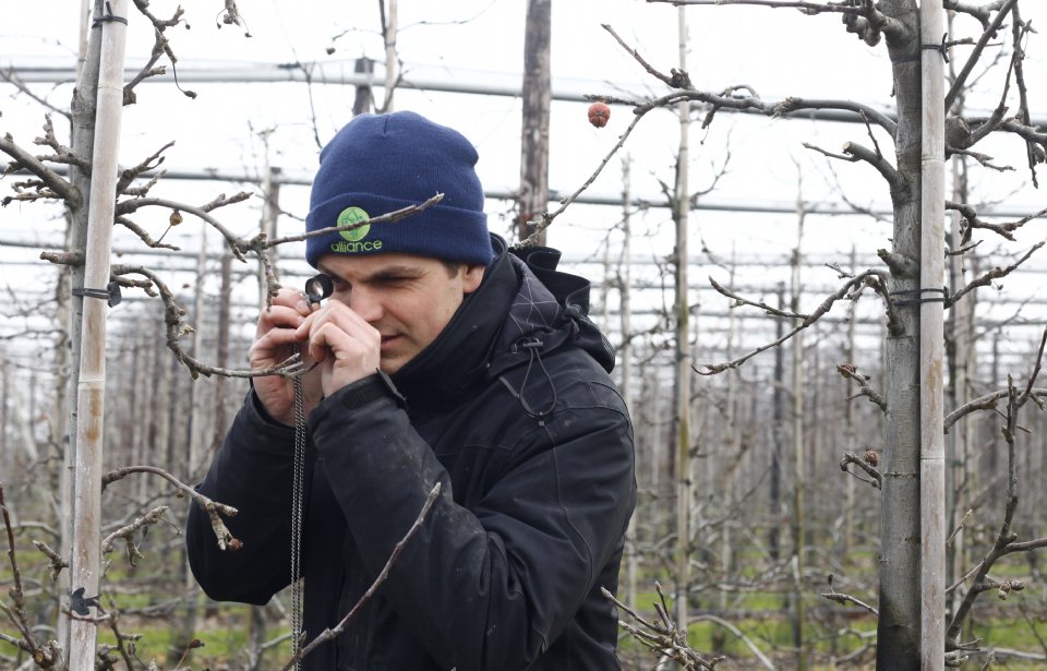 Als het bemestingsplan grofweg in orde is, stappen we in de bedrijfswagen van Vissers en bekijken we een appelperceel waarvan de bomen nog moeten worden gesnoeid. Het is begin februari nog te vroeg om te zien wat bloemknoppen zijn, dus het is op dit moment niet verstandig om veel te knippen, zo steekt Van Kessel van wal. 'Maar Henrik, je moet hier op 2 meter hoogte wel wat ingrijpen', wijst de adviseur aan. 'Er zitten veel jonge takken. Als je die laat hangen, zakken ze later met vruchten eraan door. De zware takken moet je snoeien om te zorgen voor voldoende belichting.'