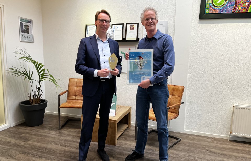 De landelijke RMV Innovatie Awards zijn onlangs uitgereikt aan SyreN in de categorie Duurzaamheid & Technologie en aan SecureCattle in de categorie Dier- & Bodemgezondheid. Lucas van 't Hof van beursorganisatie Easyfairs en voorzitter van de vakjury, ging de prijzen persoonlijk overhandigen aan de winnaars.